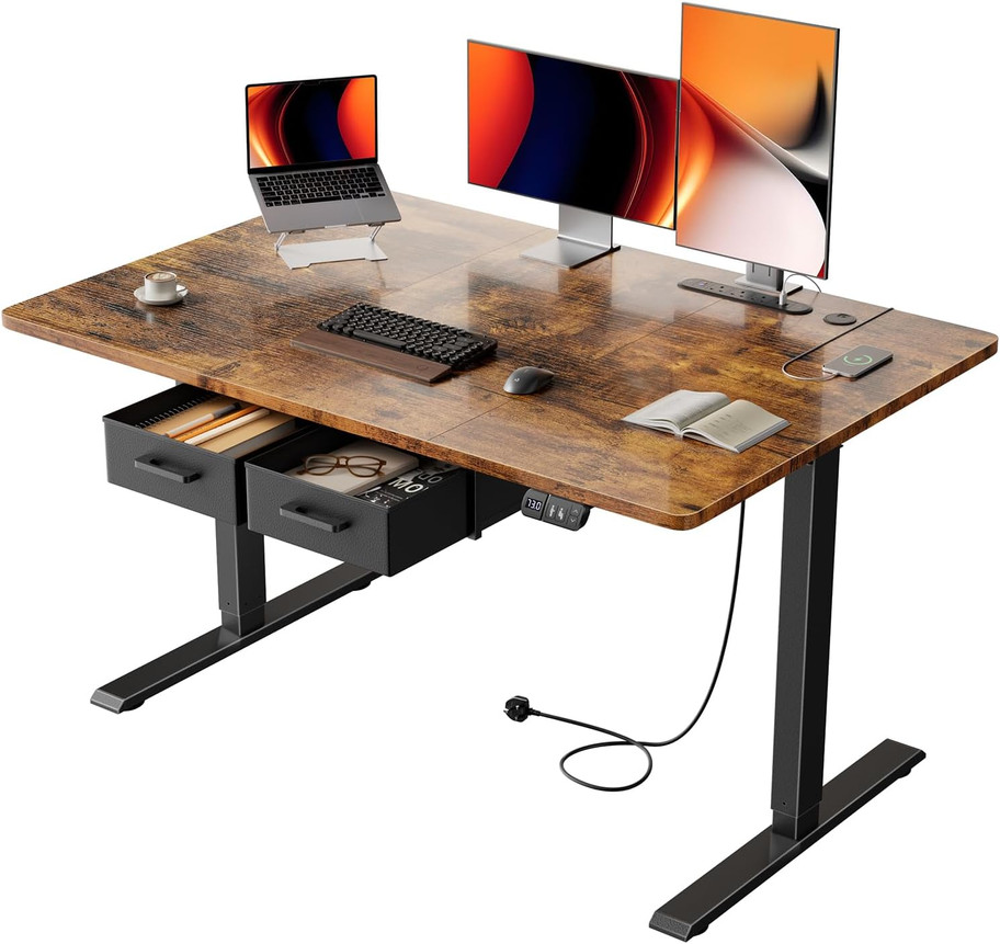 120x80cm Electric Standing Desk with Power Outlets, Height Adjustable Desk with Fabric Storage Drawer and 2 Memory Presets, Ergonomic Sit Stand Desk for Home, Office, Brown