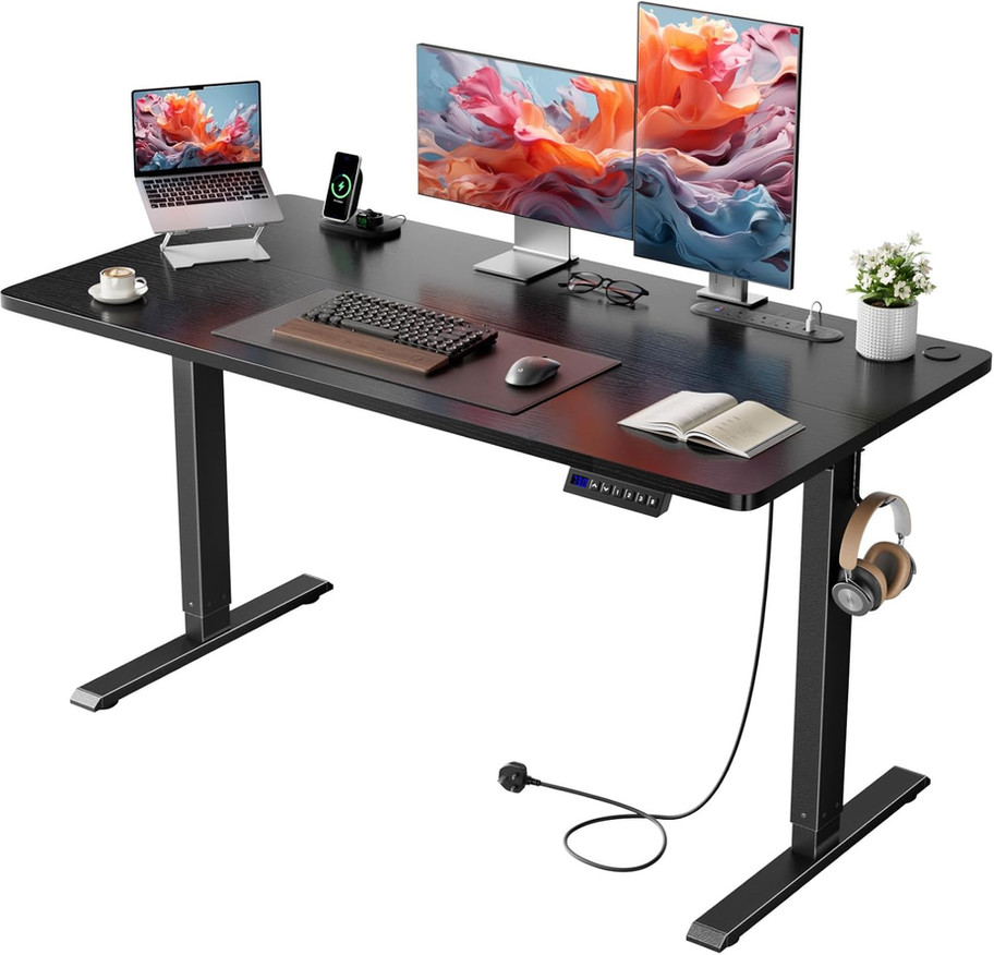 Electric Standing Desk, 100x60cm Height Adjustable Desks with 3 Power Outlets & 2 USB Ports and 3 Memory Smart Panels Home Office Desk with Headphone Hook and Splice Board (Black)